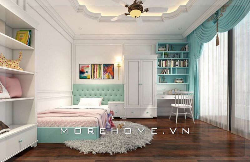 Gây ấn tượng mạnh với mọi ánh nhìn, mẫu giường ngủ trẻ em gỗ công nghiệp màu xanh tạo điểm nhấn nổi bật cho cả căn phòng