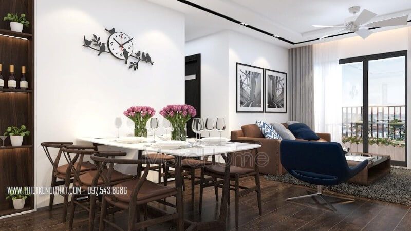 . Khu vực phòng ăn chung cư hiện đại được thiết kế gần kề với phòng khách, tạo nên một không gian sống thoải mái, sang trọng và đầy đủ tiện nghi.